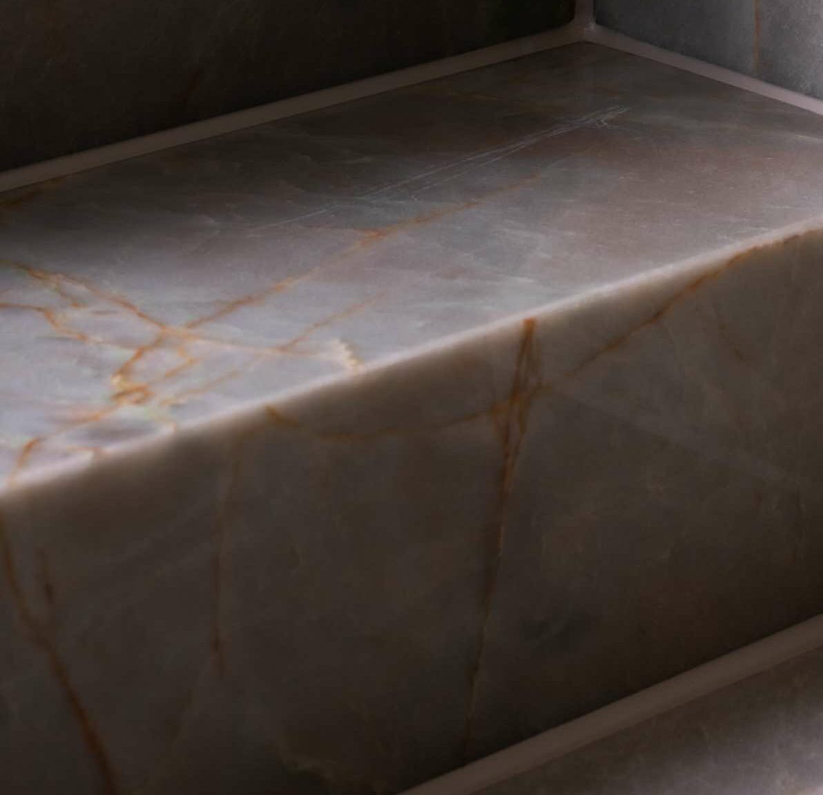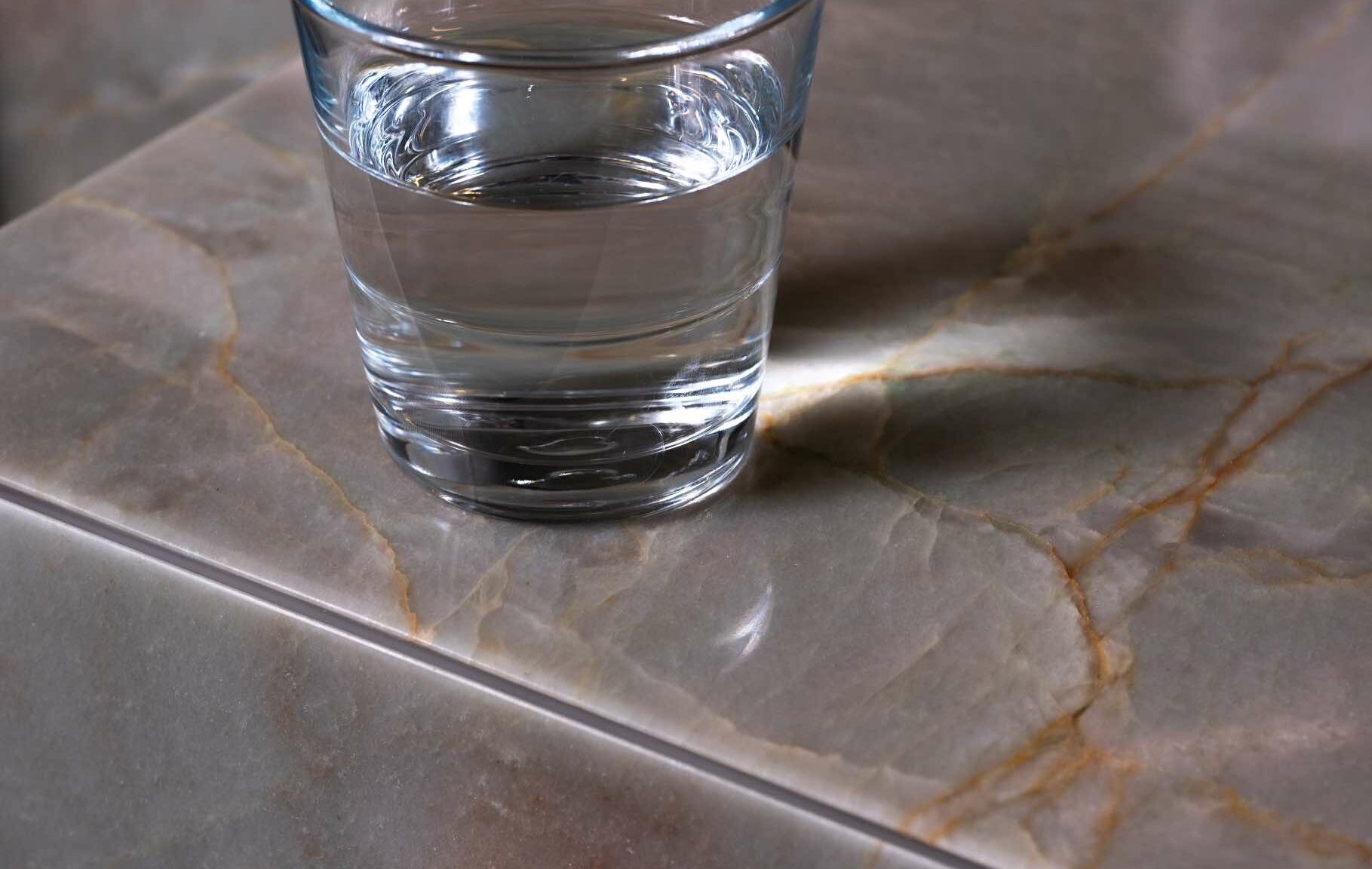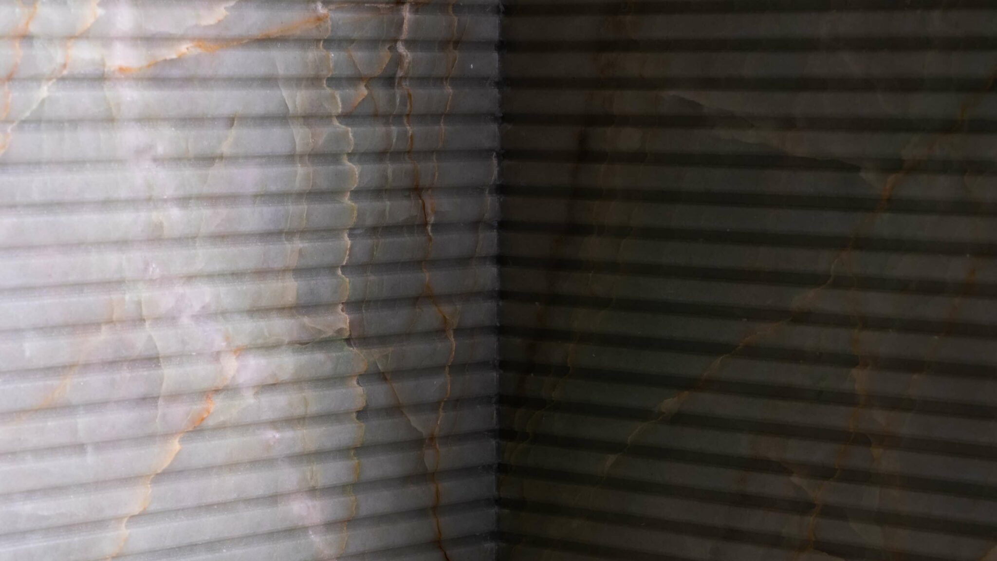 Jadore Quarzit aus Brasilien zeigt hier mit seinem spektakulären Grün-Blau, leicht rosa Flecken und bräunlichen Adern, was nur Naturstein kann. Einmal mit einer polierten, glänzenden Oberfläche, einmal in Form einer gebürsteten Rückwand mit eingefrästen Rillen.